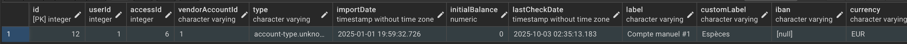 query: INSERT INTO "transaction"("userId", "accountId", "categoryId", "type", "label", "rawLabel", "customLabel", "date", "importDate", "budgetDate", "debitDate", "amount", "createdByUser", "isUserDefinedType", "isRecurrentTransaction") VALUES ($1, $2, $3, $4, $5, $6, $7, $8, $9, $10, $11, $12, $13, $14, $15) RETURNING "id", "categoryId", "type", "customLabel", "budgetDate", "debitDate", "createdByUser", "isUserDefinedType", "isRecurrentTransaction" -- PARAMETERS: [1,1,19,"type.card","TEST Encore -10","TEST Encore -10",null,"2025-08-24T22:00:00.000Z","2025-08-25T09:07:15.980Z",null,"2025-08-24T22:00:00.000Z",-10,true,true,false]